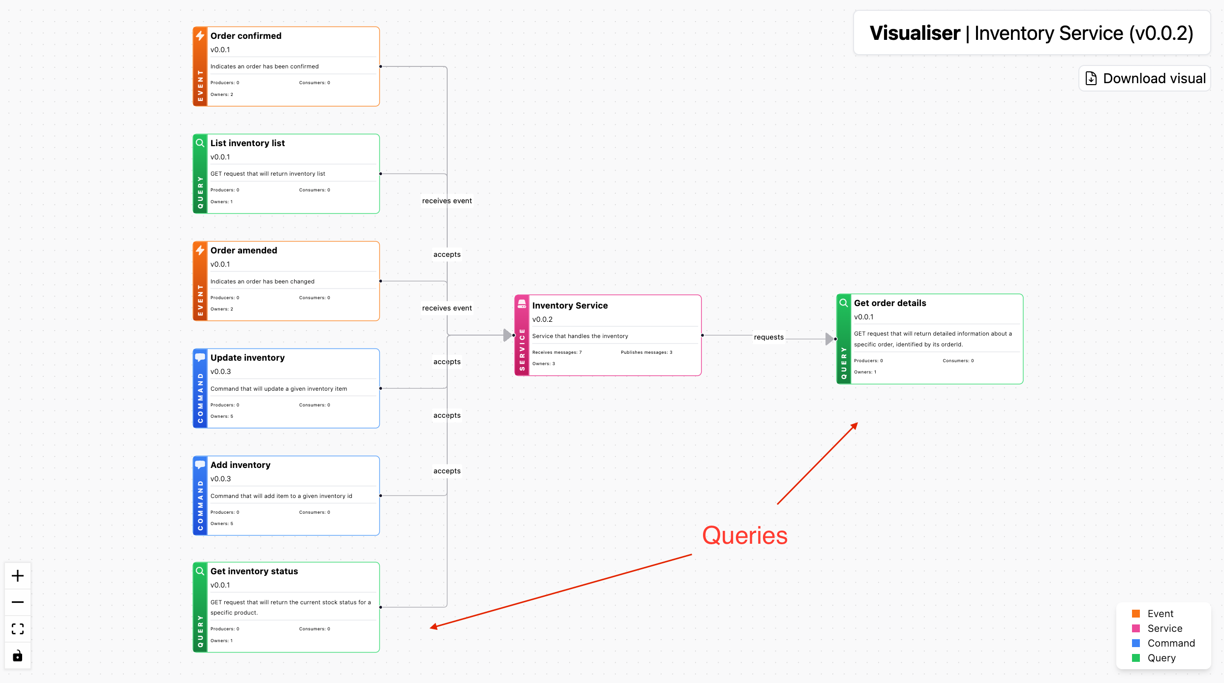 EventCatalog now includes support for documenting queries, allowing you to capture any queries your service accepts or sends. This feature enhances the ability to track and visualize the full range of messages within your architecture.